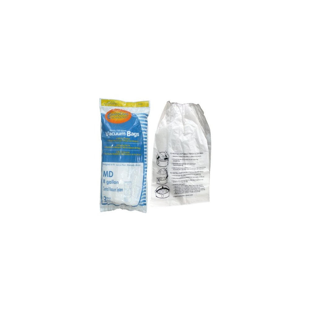 Modern Day, Flomaster, Silent Master, AirFlo, Brute, PowerKing (Pow-R-King), Sequioa, Star, StorVac & Thoromatic Micro 8 Gallon Elastic Top Allergy Vacuum Cleaner Bag Each manufacture package includes 3 MicroFine Electrostatic lined Allergen Vacuum Bags made by EnviroCare Part # MD814 Envirocare Parts designed to fit with or replace genuine original (OEM) manufacture part numbers below: 720H-5, Replaces older #720-5 This bag fits over the blue cloth support. The bag was designed to be big so there would be more area to filter the air. After inserting the bag, open it up inside the vacuum by pushing down and out from the sides. Designed to fit the vacuum models listed below and more: Modern Day (MD) and other Central Vacuum Systems: Style Model Numbers ModernDay A, B, B2, J, K, and SR Flo-Master M19, M31, M32, M34, M45, M64, M72, M85, and M92 Silent Master open bag units under 34 inches in total length Action open bag units under 34 inches in total length AirFlo, open bag units under 34 inches in total length Brute open bag units under 34 inches in total length PowerKing, Pow-R-King open bag units under 34 inches in total length Sequoia open bag units under 34 inches in total length Star open bag units under 34 inches in total length StorVac open bag units under 34 inches in total length Thoromatic open bag units under 34 inches in total length Dimensions: 18 1/2" x 14" Bag Size with an elastic band on the top Bag Diameter stretches to approximately 24" Traps and seals-in 99.7% of dust mites, pollens, ragweed, mold spurs, microscopic particles, bacteria, dust mites, germs as small as 0.1 micron, other allergy causing agents, and 99.9% of pet dander. A must for Allergy Sufferers!
